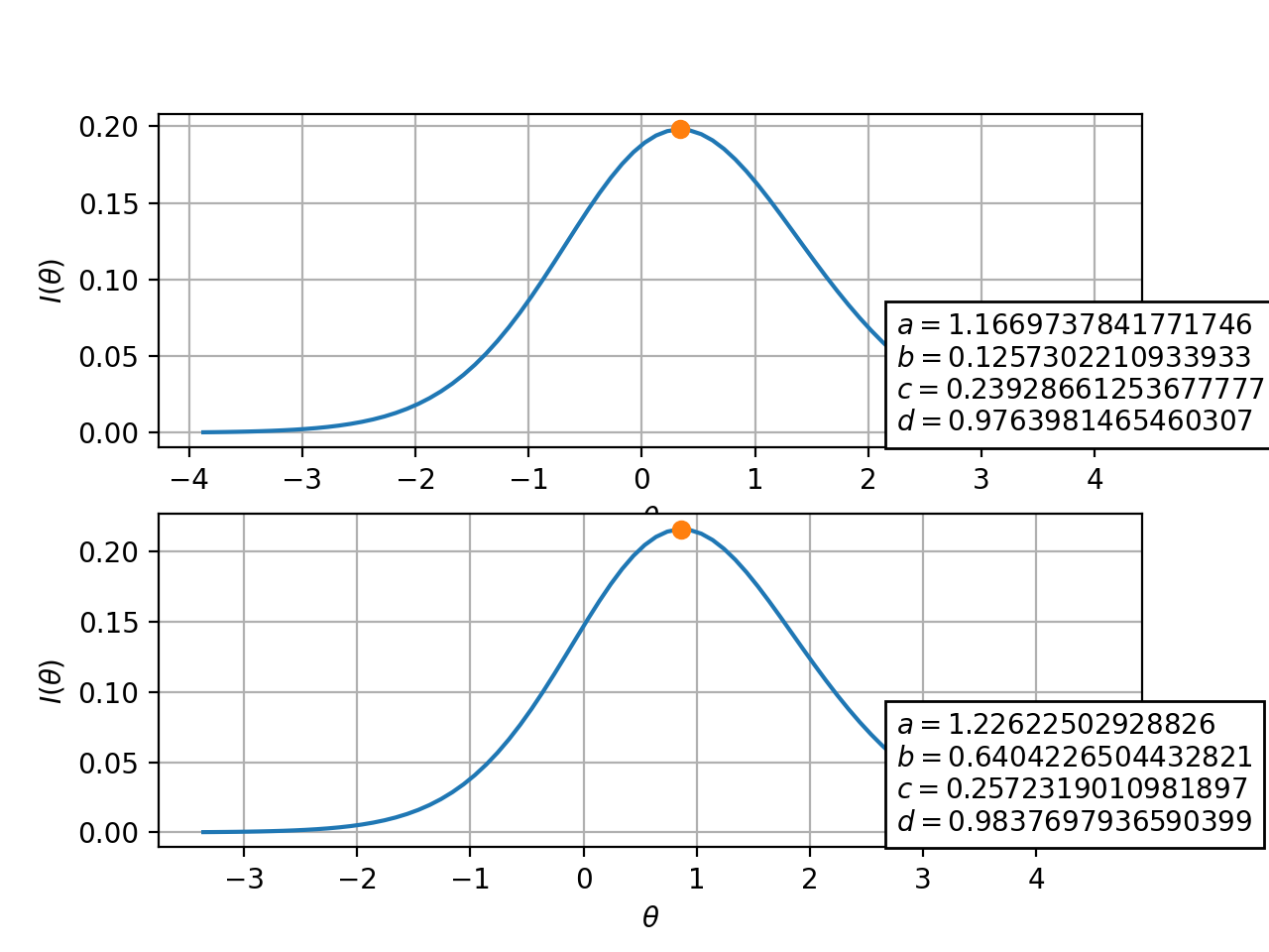 - catsim.irt.inf(theta: float, a: float, b: float, c: float = 0, d: float = 1) float[source]