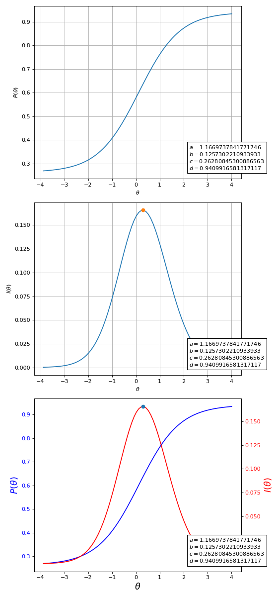 Fig. 11 Item characteristic and information functions for a given item. Last plot contains both curves together.