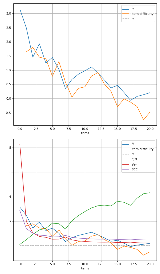 Note that, while some functions increase or decrease monotonically (like test information and standard error of estimation), the plot calculates these values using the examinee’s ability estimated at that given time of the test. This means that a test that was thought to be informative at a given point may not be as informative after new estimates are made.