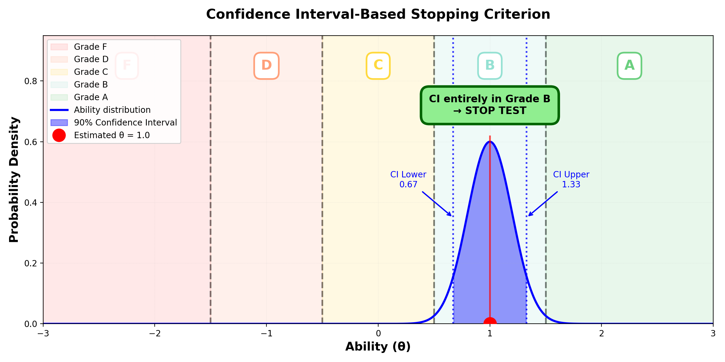 The figure below illustrates the concept with an example where an examinee’s ability is estimated at θ = 1.0 with a confidence interval that falls entirely within the grade B interval [0.5, 1.5), causing the test to stop.